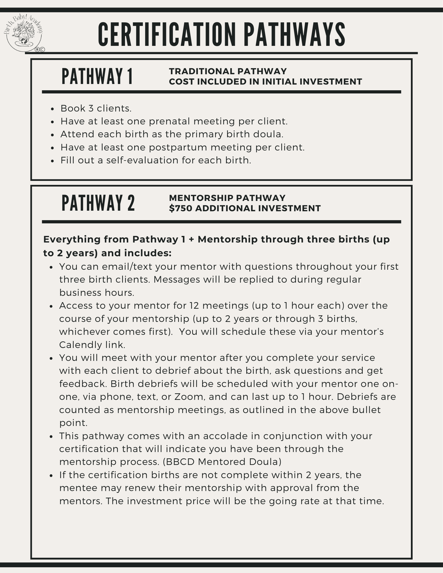 The Mentorship Pathway is one of the ways to get your certification as a birth doula. Pathway 1 is included with the price of training and is all that’s required for certification. For those desiring more mentorship through the process, Pathway 2 is the way to go! For more details, see below!